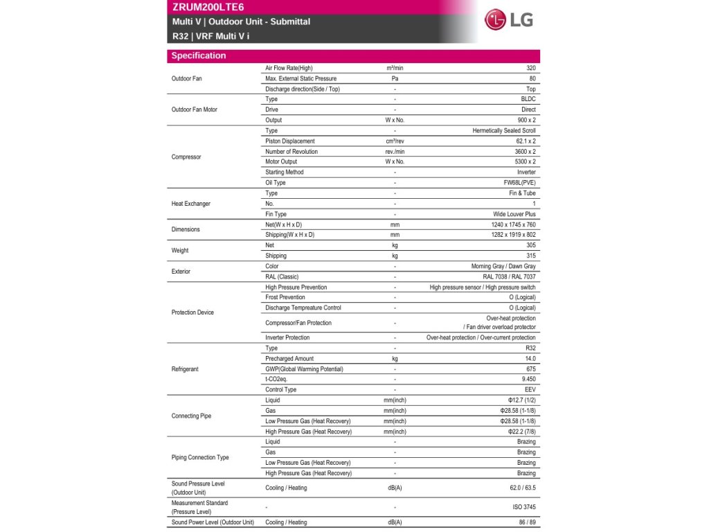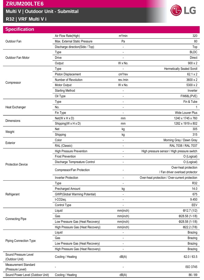 LG Kondenzačná jednotka MULTI V i - R32 ZRUM200LTE6 VÝKON CH/V 56/56 KW 3F