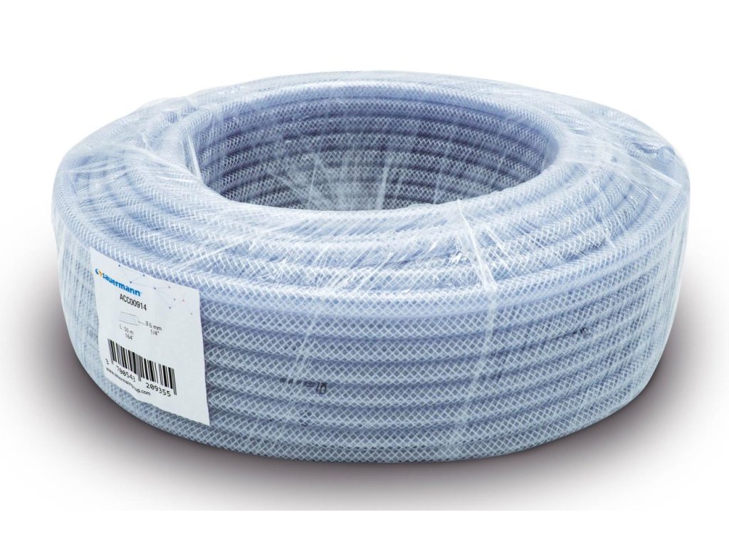 Priehľadná zosilnená PVC hadica Ø 6 mm (1/4'') na pripojenie čerpadla k výtlačnému otvoru. Návin 50 m